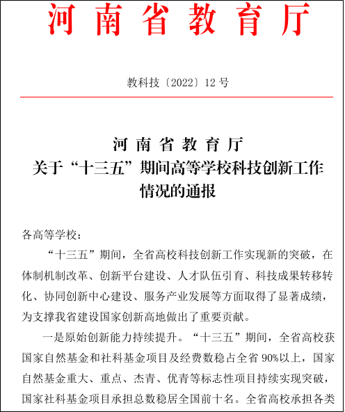 近日,河南省教育厅印发了《关于“十三五”期间高等学校科研创新工作情况的通报》(教科技〔2022〕12 号),beat365科研处荣获“河南省高校科研管理工作先进集体”,陈晓丽、张倩丽、刘灿等三位同志荣获“河南省高校科研管理工作先进工作者”。
