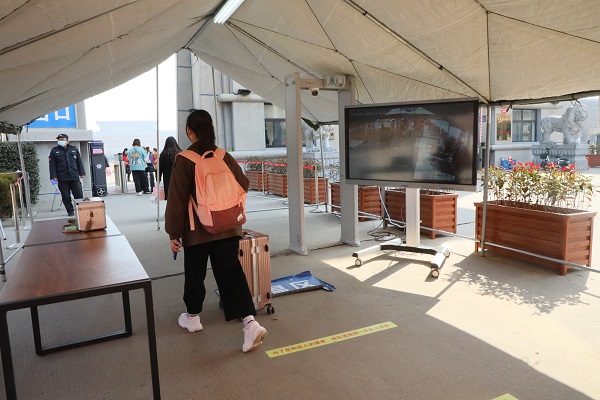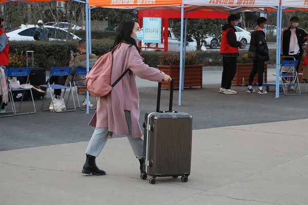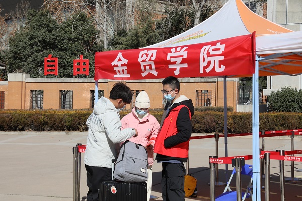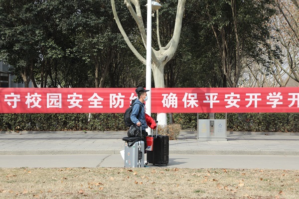 返校前,各学院下发返校预通知,帮助学生明晰返校流程,提醒学生了解掌握疫情风险等级、防疫政策和查验健康打卡、行程码、健康码、核酸检测报告等相关信息,线上提交审批通过后方可返校。返校当天“严把入口关”,经过身份核验、扫码登记、体温检测、行李消杀等步骤方可进入校园,乘坐摆渡车直达宿舍。