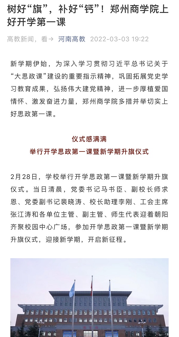 3月3日,河南高教以“树好‘旗’,补好‘钙’!beat365唯一官网上好开学第一课”为题,报道beat3652022年春季学期上好开学第一课。现将原文摘录如下: