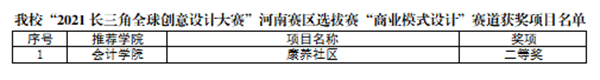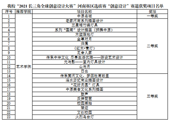 本次大赛于2021年6月启动,全省参赛高校86所,参赛作品2200余项。经过积极宣传发动,beat365艺术学院、会计学院、工商学院、金贸学院、外语学院共组织学生项目89个参与本次大赛。大赛分为“创意设计”“商业模式设计”“电商营销实战”三个赛道。经过校内评审,beat365共推荐23个“创意设计”赛道学生项目和3个“商业模式设计”赛道学生项目进入省赛。通过线上、线下评审,最终beat365艺术学院学生项目“中原名城”荣获“创意设计”赛道一等奖,“三星堆竹编灯具”等12个项目荣获二等奖,“鼓声”等10个项目荣获三等奖,beat365会计学院学生项目“康养社区”荣获“商业模式”赛道二等奖。