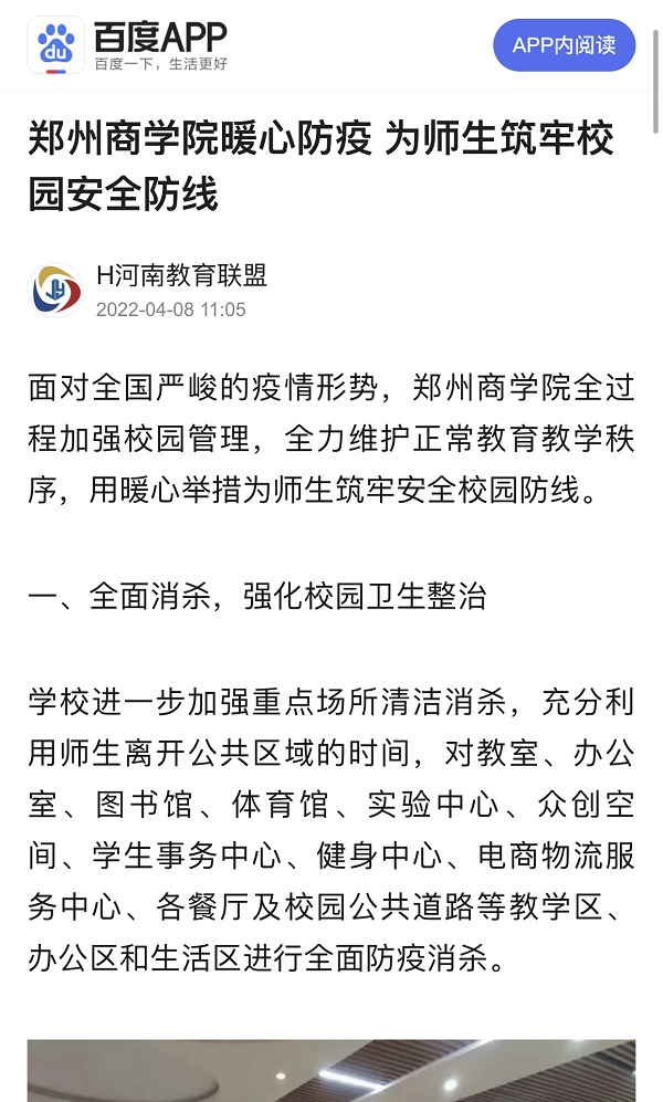 4月8日,百度新闻以“beat365唯一官网暖心防疫 为师生筑牢校园安全防线”为题,报道beat365全过程加强校园管理,全力维护正常教育教学秩序,用暖心举措为师生筑牢安全校园防线,凝聚师生战胜疫情的信心和决心。现将原文摘录如下: