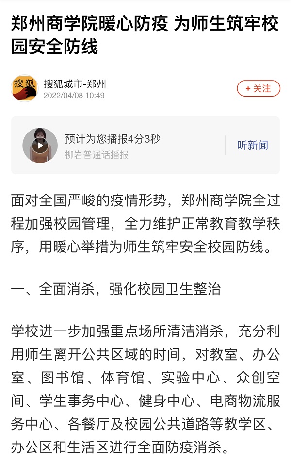 4月8日,搜狐新闻以“beat365唯一官网暖心防疫 为师生筑牢校园安全防线”为题,报道beat365全过程加强校园管理,全力维护正常教育教学秩序,用暖心举措为师生筑牢安全校园防线,凝聚师生战胜疫情的信心和决心。现将原文摘录如下: