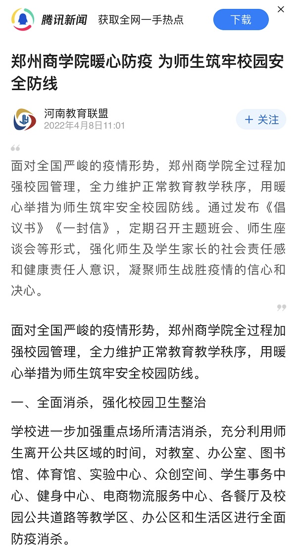 创新宣传形式,丰富宣传载体,以身边事教育身边人,凝聚起风雨同舟、共渡难关的强大力量。一是突出重点,普及防疫政策和防疫知识。编印《防控简报》《防控知识手册》,充分利用微博、微信、抖音、快手等平台,教育引导广大师生掌握防控政策和防疫知识,提高个人防护意识和防护能力。二是强化宣传,凝聚战胜疫情的信心和决心。通过发布《倡议书》《一封信》,定期召开主题班会、师生座谈会等形式,强化师生及学生家长的社会责任感和健康责任人意识,凝聚师生战胜疫情的信心和决心。三是挖掘典型,讲好郑商师生抗疫故事。持续开展“把灾难当教材 与祖国共成长”主题教育活动,号召青年学子厚植家国情怀、彰显责任担当。四是舆论引导,加强正面宣传。及时回应师生合理诉求与关切,加强心理疏导,消除师生在疫情紧张时期的恐慌心理。