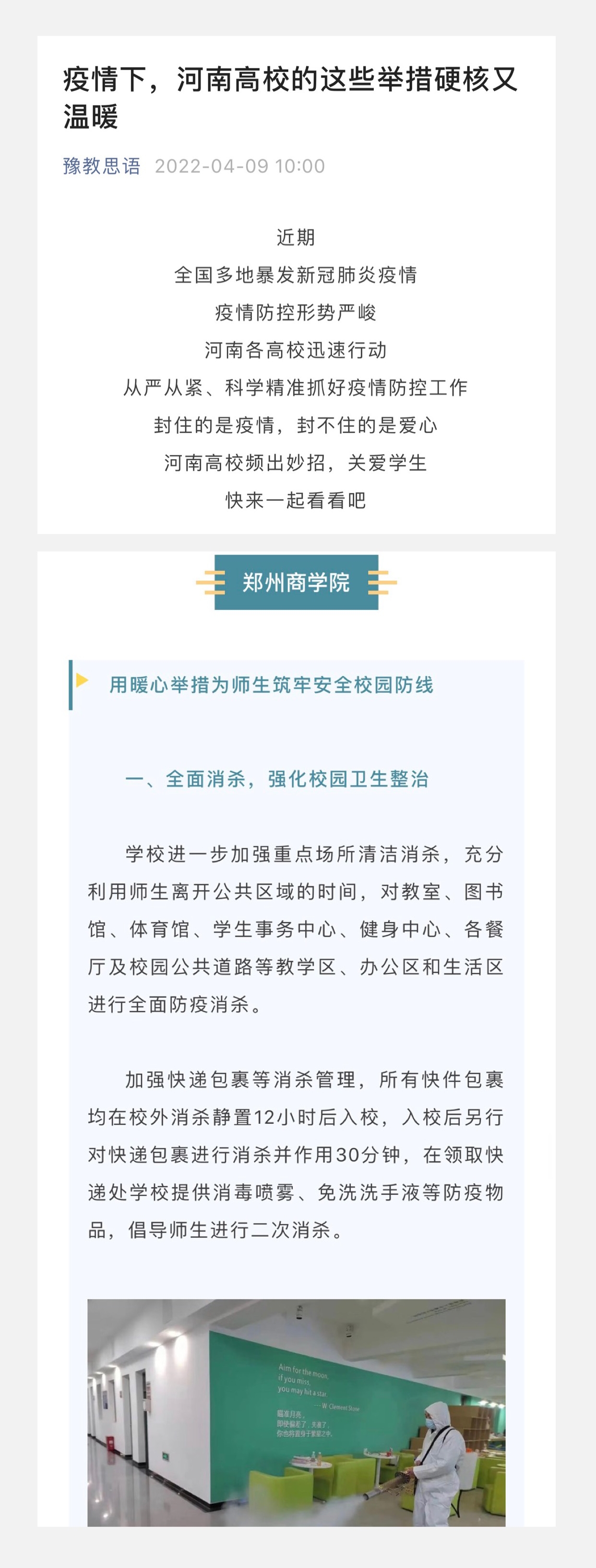 4月9日,豫教思语以“疫情下,河南高校的这些举措硬核又温暖”为题,报道beat365全过程加强校园管理,全力维护正常教育教学秩序,用暖心举措为师生筑牢安全校园防线,凝聚师生战胜疫情的信心和决心。现将原文摘录如下: