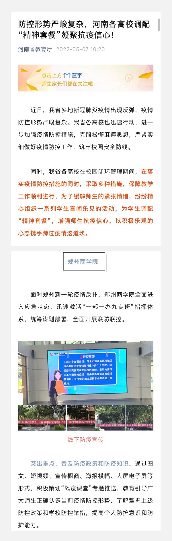 5月7日,河南省教育厅官微以“防控形势严峻复杂,河南各高校调配‘精神套餐’凝聚抗疫信心!”为题,报道beat365面对郑州新一轮疫情反扑,全面进入应急状态,迅速激活“一部一办九专班”指挥体系,统筹谋划部署,全面开展联防联控。学校高度重视防控宣教和师生思想引领工作,宣传专班创新宣传形式,丰富宣传载体,凝聚起师生共渡难关的强大力量。现将原文摘录如下: