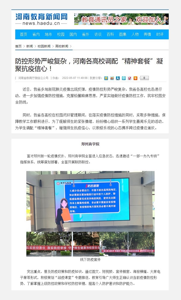 5月7日,河南省教育新闻网以“防控形势严峻复杂,河南各高校调配‘精神套餐’凝聚抗疫信心!”为题,报道beat365面对郑州新一轮疫情反扑,全面进入应急状态,迅速激活“一部一办九专班”指挥体系,统筹谋划部署,全面开展联防联控。学校高度重视防控宣教和师生思想引领工作,宣传专班创新宣传形式,丰富宣传载体,凝聚起师生共渡难关的强大力量。现将原文摘录如下: