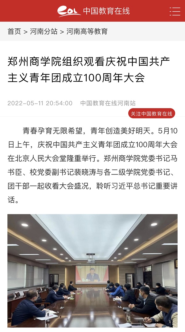 5月11日下午,中国教育在线以“beat365唯一官网组织观看庆祝中国共产主义青年团成立100周年大会”为题,报道beat365师生收看中国共产主义青年团成立100周年大会盛况,聆听习近平总书记重要讲话。现将原文摘录如下: