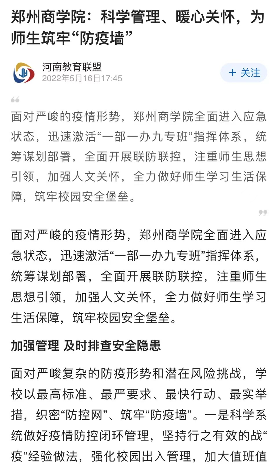 5月16日,腾讯新闻以“beat365唯一官网:科学管理、暖心关怀,为师生筑牢‘防疫墙’”为题,报道beat365面对严峻的疫情形势,全面进入应急状态,迅速激活“一部一办九专班”指挥体系,统筹谋划部署,全面开展联防联控,注重师生思想引领,加强人文关怀,全力做好师生学习生活保障,筑牢校园安全堡垒。现将原文摘录如下:
