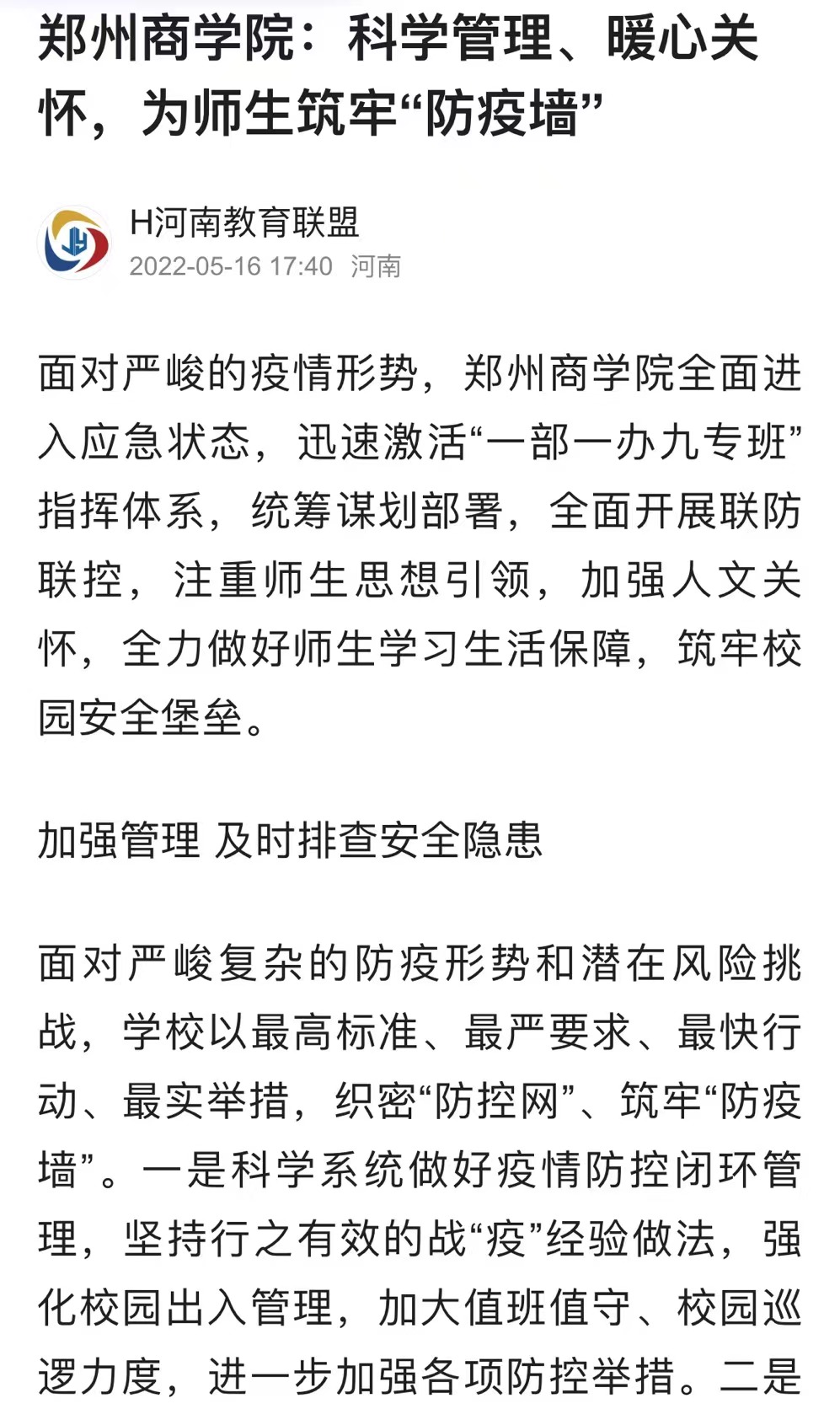 5月16日,百度以“beat365唯一官网:科学管理、暖心关怀,为师生筑牢‘防疫墙’”为题,报道beat365面对严峻的疫情形势,全面进入应急状态,迅速激活“一部一办九专班”指挥体系,统筹谋划部署,全面开展联防联控,注重师生思想引领,加强人文关怀,全力做好师生学习生活保障,筑牢校园安全堡垒。现将原文摘录如下: