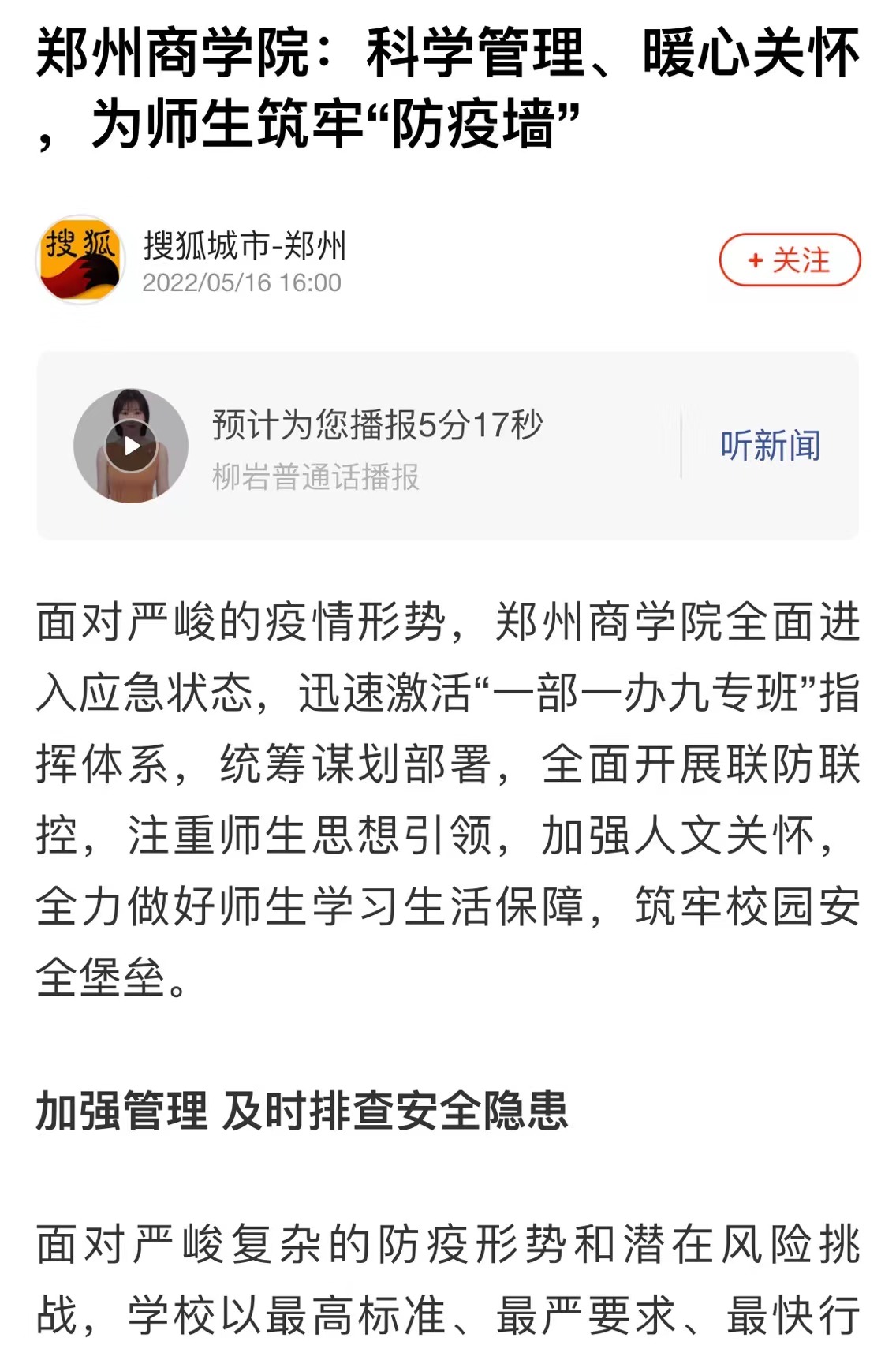 5月16日,搜狐城市-郑州以“beat365唯一官网:科学管理、暖心关怀,为师生筑牢‘防疫墙’”为题,报道beat365面对严峻的疫情形势,全面进入应急状态,迅速激活“一部一办九专班”指挥体系,统筹谋划部署,全面开展联防联控,注重师生思想引领,加强人文关怀,全力做好师生学习生活保障,筑牢校园安全堡垒。现将原文摘录如下: