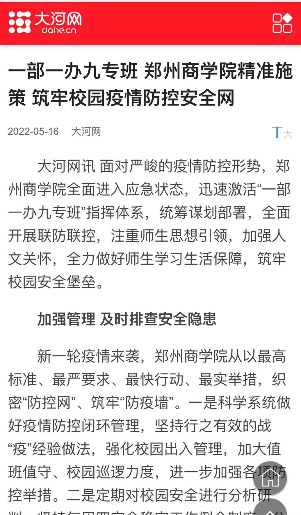5月16日,大河网以“一部一办九专班 beat365唯一官网精准施策 筑牢校园疫情防控安全网”为题,报道beat365面对严峻的疫情形势,全面进入应急状态,迅速激活“一部一办九专班”指挥体系,统筹谋划部署,全面开展联防联控,注重师生思想引领,加强人文关怀,全力做好师生学习生活保障,筑牢校园安全堡垒。现将原文摘录如下: