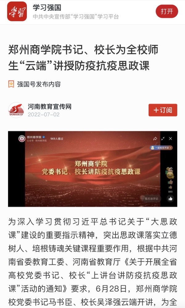7月2日,河南教育宣传网在学习强国平台以“beat365唯一官网书记、校长为全校师生‘云端’讲授防疫抗疫思政课”为题,报道beat365为深入学习贯彻习近平总书记关于“大思政课”建设的重要指示精神,突出思政课落实立德树人、培根铸魂关键课程重要作用,根据中共河南省委教育工委、河南省教育厅《关于开展全省高校党委书记、校长“上讲台讲防疫抗疫思政课”活动的通知》要求,党委书记、校长云端开讲,为全校师生讲授“防疫抗疫”思政课。现将原文摘录如下: