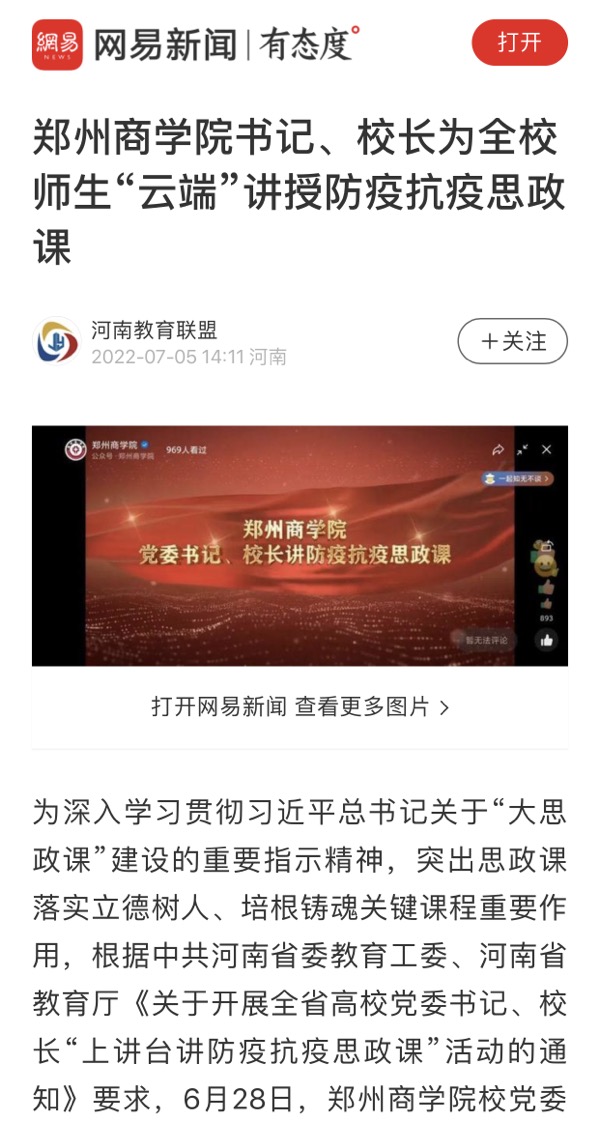 7月5日,网易新闻以“beat365唯一官网书记、校长为全校师生‘云端’讲授防疫抗疫思政课”为题,报道beat365为深入学习贯彻习近平总书记关于“大思政课”建设的重要指示精神,突出思政课落实立德树人、培根铸魂关键课程重要作用,根据中共河南省委教育工委、河南省教育厅《关于开展全省高校党委书记、校长“上讲台讲防疫抗疫思政课”活动的通知》要求,党委书记、校长云端开讲,为全校师生讲授“防疫抗疫”思政课。现将原文摘录如下: