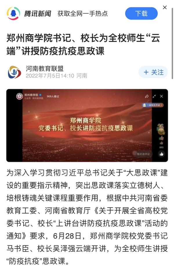 7月5日,腾讯新闻以“beat365唯一官网书记、校长为全校师生‘云端’讲授防疫抗疫思政课”为题,报道beat365为深入学习贯彻习近平总书记关于“大思政课”建设的重要指示精神,突出思政课落实立德树人、培根铸魂关键课程重要作用,根据中共河南省委教育工委、河南省教育厅《关于开展全省高校党委书记、校长“上讲台讲防疫抗疫思政课”活动的通知》要求,党委书记、校长云端开讲,为全校师生讲授“防疫抗疫”思政课。现将原文摘录如下: