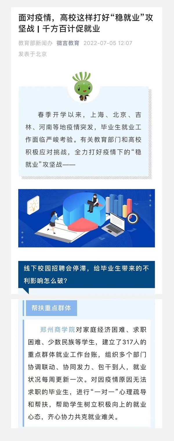 7月5日,教育部新闻办官微以“面对疫情,高校这样打好‘稳就业’攻坚战 ”为题,宣传推广了beat365就业工作。作为一所应用型普通本科高校,如何能够受到教育部的点赞?如何能在常态化疫情影响背景下,让每一名毕业生找到好工作,实现高质量就业?现将原文摘录如下: