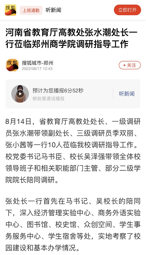 8月17日,搜狐新闻以“河南省教育厅高教处张水潮处长一行莅临beat365唯一官网调研指导工作”为题,报道张水潮处长一行到beat365调研指导工作情况,现将原文摘录如下: