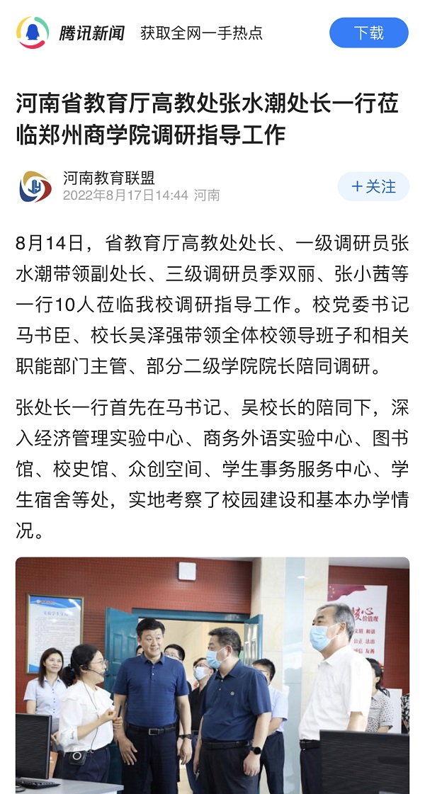8月17日,腾讯新闻以“河南省教育厅高教处张水潮处长一行莅临beat365唯一官网调研指导工作”为题,报道张水潮处长一行到beat365调研指导工作情况,现将原文摘录如下: