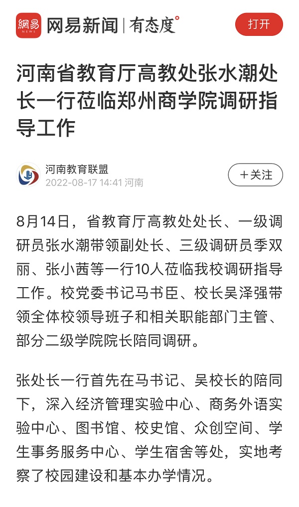 8月17日,网易新闻以“河南省教育厅高教处张水潮处长一行莅临beat365唯一官网调研指导工作”为题,报道张水潮处长一行到beat365调研指导工作情况,现将原文摘录如下: