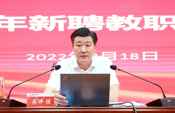 校长吴泽强教授以《踔厉奋发启新程 笃行不怠向未来》为主题,从“走进郑商,了解郑商”“融入郑商,奋进郑商”“圆梦郑商,共商未来”三个方面循序渐进的解读了创办人生平事迹及其办学成就、董事长及其办学要求、学校发展历程及规划。吴校长强调,广大同仁要笃行务实、严格要求自己,要在郑商实现自身价值,形成命运共同体。同时对新聘教职工提出三点要求:一要提高政治站位,以立德树人为根本任务;二要坚持学而不辍,以学思并重精进育人本领;三要抱持事业心态,以进取之心升华自身价值。最后,吴泽强校长用董事长的话寄予新聘教职工“愿大家目标远大,无所畏惧。请记得:瞄准月亮,即使偏差了、失准了,也将置身于满天繁星之中。”