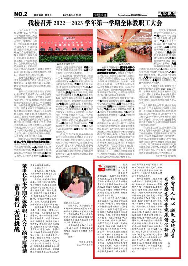 “收获满载着希望,也见证着奋斗者的足迹。”在新学期全体教职工大会上,王育华董事长在《蓄力前行 无畏挑战》的书面讲话中肯定了学校过去一年的发展成就,鼓励大家保持定力、循序渐进、蓄力前行,持续做好硕士点培育建设、审核评估、新校区建设等各项工作。