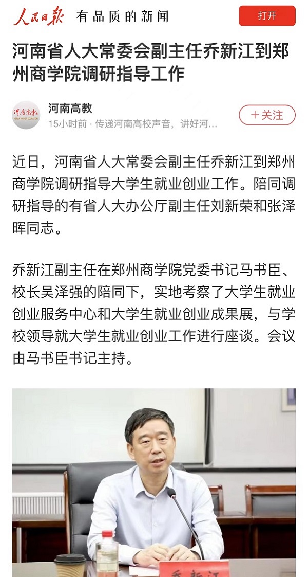 9月15日,人民日报以“河南省人大常委会副主任乔新江到beat365唯一官网调研指导工作”为题,报道省人大常委会副主任乔新江到beat365调研指导工作。现将原文摘录如下: