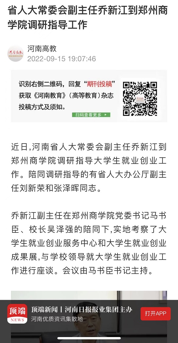 马书臣、吴泽强共同表示,乔主任百忙之中莅临学校调研指导,对我们统一思想、增强信心、谋求发展具有重大指导意义。学校将认真领会、深入思考,并及时通过党委中心组理论学习、党政联席会等方式研究部署,严格落实乔主任讲话精神,把工作要求和鼓励转化为干事创业的前进方向与发展动力,以坚定的态度、务实的行动,落实好立德树人根本任务,努力提高人才培养质量与大学生就业创业工作水平,不断推动学校高质量发展,努力培养德智体美劳全面发展的社会主义建设者和接班人,以实际行动迎接党的二十大胜利召开。