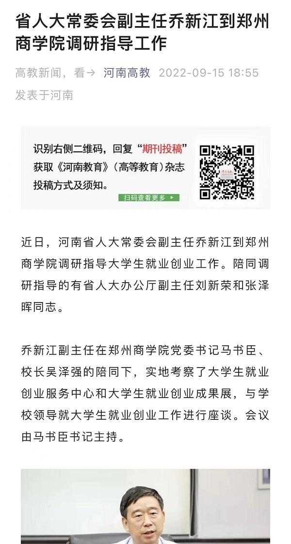 9月15日,河南高教以“省人大常委会副主任乔新江到beat365唯一官网调研指导工作”为题,报道省人大常委会副主任乔新江莅临beat365唯一官网调研指导工作。现将原文摘录如下: