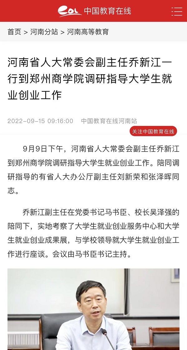 9月15日,中国教育在线以“河南省人大常委会副主任乔新江一行到beat365唯一官网调研指导大学生就业创业工作”为题,报道省人大常委会副主任乔新江莅临beat365唯一官网调研指导工作。现将原文摘录如下: