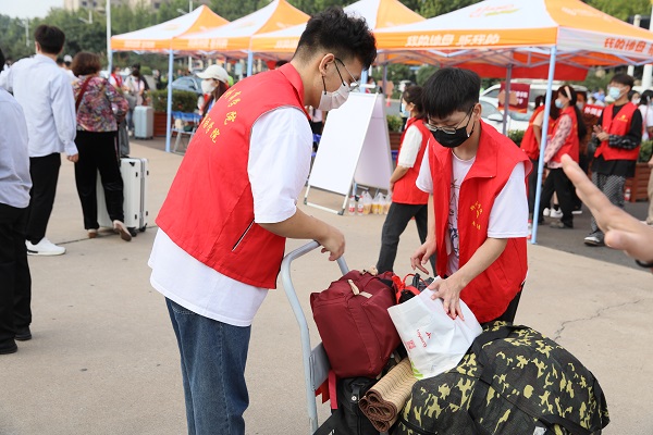 校内外随处可见志愿者们争先为新生搬运行李、指引报到、引导入宿、熟悉环境、解答疑惑的情景,气氛十分热闹。