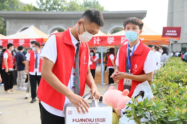 学校还特地为新生们制作郑商文创、拍照打卡处,吸引广大新生纷纷拍照留念,为他们定格下入学的欣喜与快乐;特别设计“打卡积赞兑换郑商文创活动”,学生与迎新合影墙打卡拍照分享至社交媒体,满赞即可领取郑商专属口罩、笔记本、书签、钥匙扣、便利贴、雨伞等实用性文创礼品。
