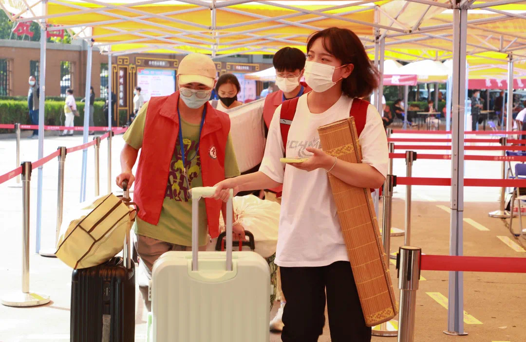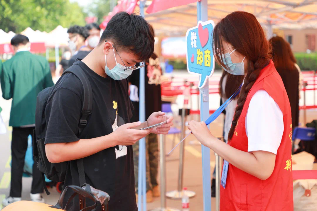 为了保证新生们平安顺利入校,学校做实做细疫情防控工作。据健康中心的李露露介绍,校门处共开设了多个体温监测点,配备了专门的消杀员,投放大量口罩、消毒液等防疫物资。“学校始终把学生的平安健康放在首位,校内统一安排了12个核酸检测点,让学生入校后可直接进行核酸检测。”随后,暖心提示:“刚入秋,气温变化大,要照顾好身体,让父母放心、自己安心。”迎新现场还有许多忙碌的身影,他们坚守岗位,认真负责,把好入校第一关。