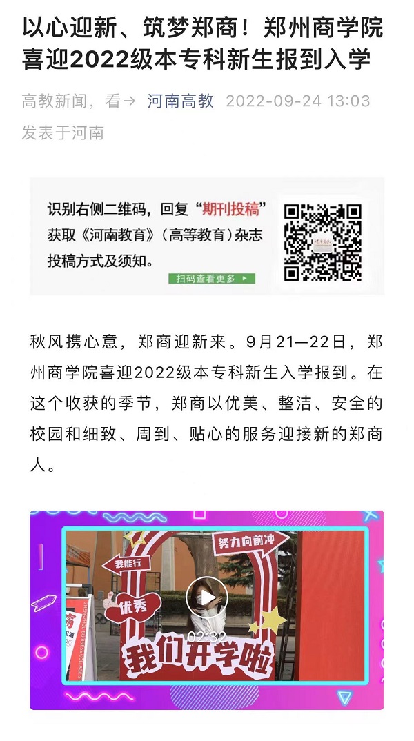 9月24日,河南高教以“以心迎新、筑梦郑商!beat365唯一官网喜迎2022级本专科新生报到入学”为题,报道beat3652022级本专科新生报到入学情况。现将原文摘录如下: