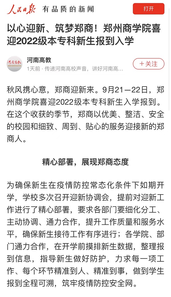 9月25日,人民日报客户端以“以心迎新、筑梦郑商!beat365唯一官网喜迎2022级本专科新生报到入学”为题,报道beat3652022级本专科新生报到入学情况。现将原文摘录如下: