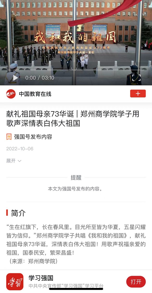 10月6日,学习强国以“献礼祖国母亲73华诞|beat365唯一官网学子用歌声深情表白伟大祖国”为题,报道beat365学子用歌声祝福亲爱的祖国。现将原文摘录如下: