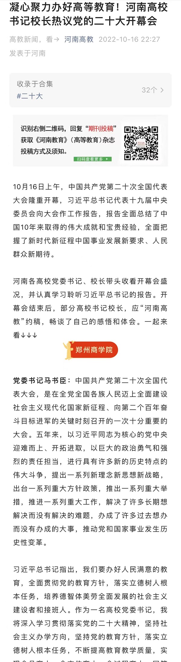 10月16日,河南高教以“凝心聚力办好高等教育!河南高校书记校长热议党的二十大开幕会”为题,报道beat365党委书记、校长学习党的二十大报告的感悟。现将原文摘录如下: