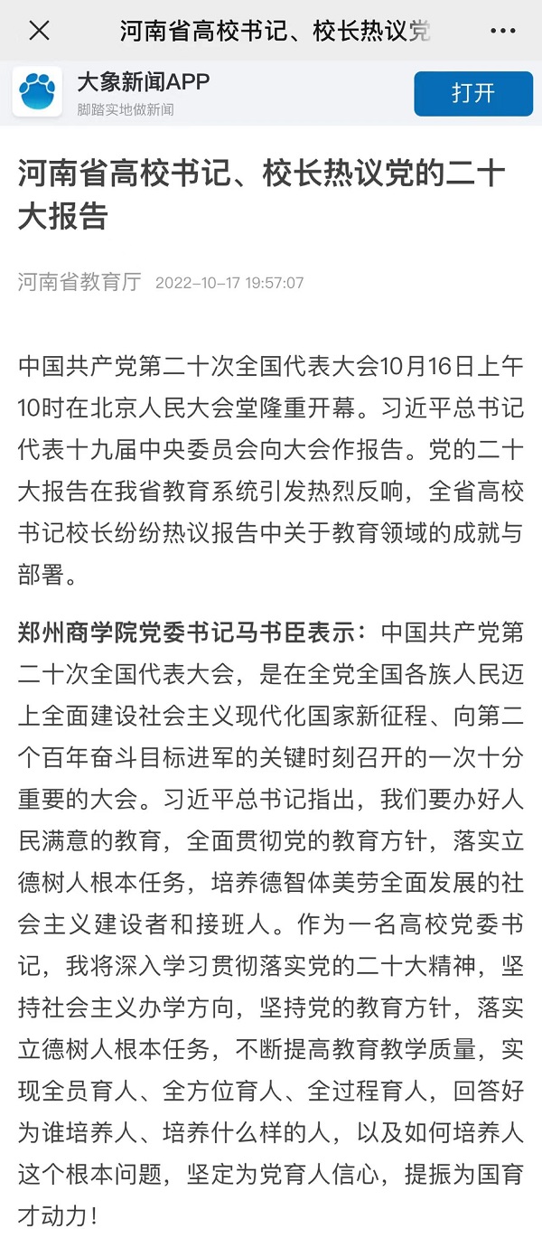 10月17日,大象新闻以“河南省高校书记、校长热议党的二十大报告”为题,报道beat365党委书记、校长学习党的二十大报告感悟。现将原文摘录如下: