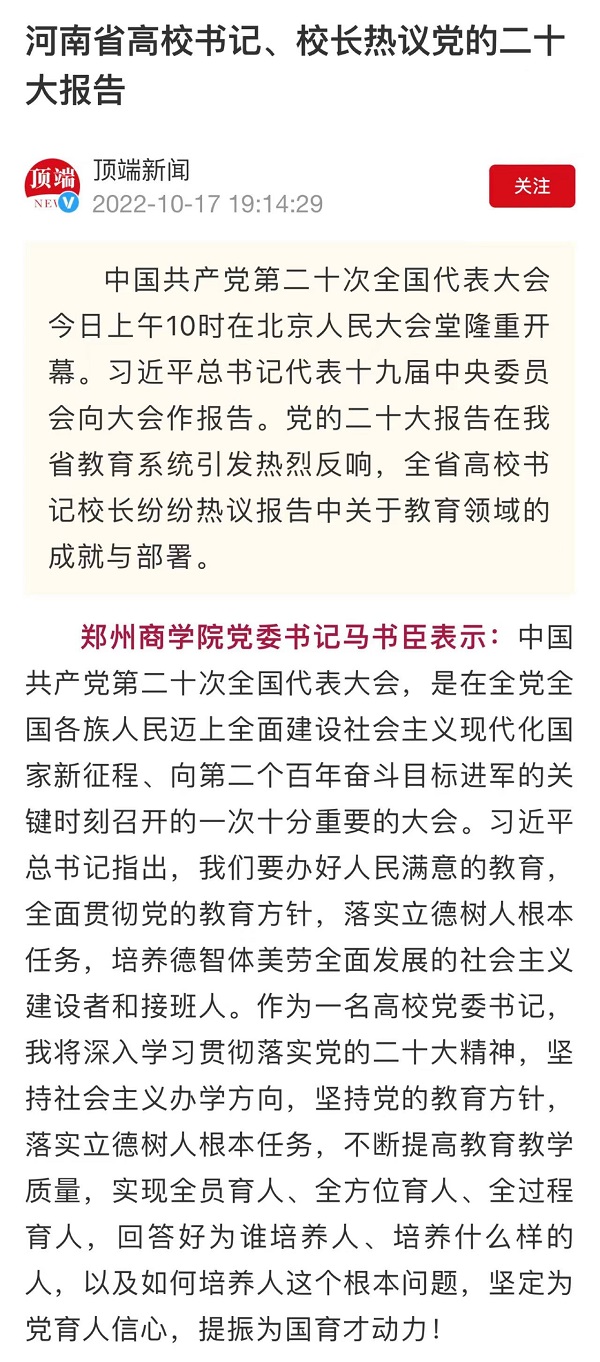 10月17日,顶端新闻以“河南省高校书记、校长热议党的二十大报告”为题,报道beat365党委书记、校长学习党的二十大报告感悟。现将原文摘录如下:
