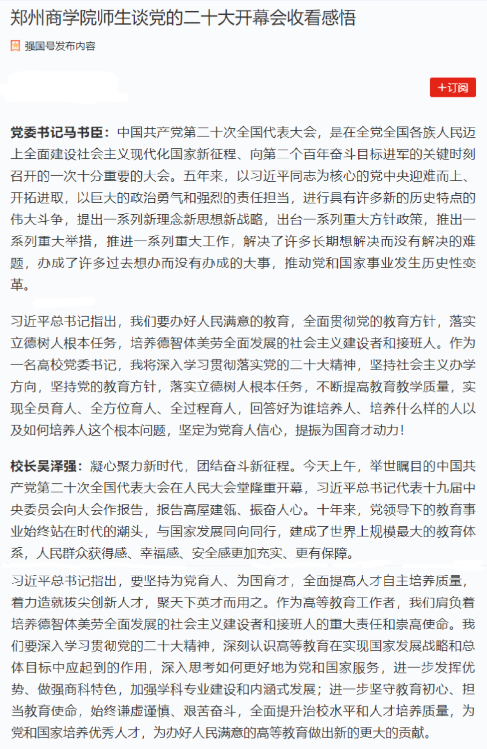 习近平总书记指出,要坚持为党育人、为国育才,全面提高人才自主培养质量,着力造就拔尖创新人才,聚天下英才而用之。作为高等教育工作者,我们肩负着培养德智体美劳全面发展的社会主义建设者和接班人的重大责任和崇高使命。我们要深入学习贯彻党的二十大精神,深刻认识高等教育在实现国家发展战略和总体目标中应起到的作用,深入思考如何更好地为党和国家服务,进一步发挥优势、做强商科特色,加强学科专业建设和内涵式发展;进一步坚守教育初心、担当教育使命,始终谦虚谨慎、艰苦奋斗,全面提升治校水平和人才培养质量,为党和国家培养优秀人才,为办好人民满意的高等教育做出新的更大的贡献。
