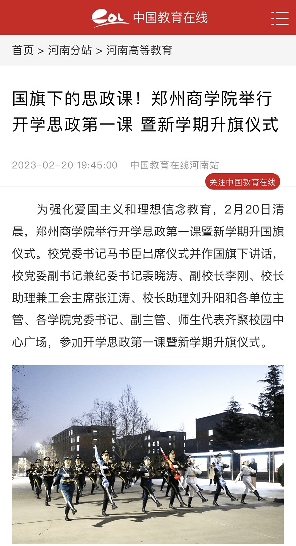 2月21日,大河网以“beat365唯一官网:国旗下的‘开学思政第一课’”为题,报道beat365举行开学思政第一课暨新学期升国旗仪式。现将原文摘录如下: