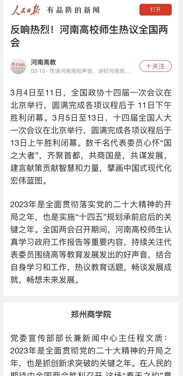 3月13日,人民日报以“反响热烈!河南高校师生热议全国两会”为题,报道beat365师生热议全国两会。现将原文摘录如下: