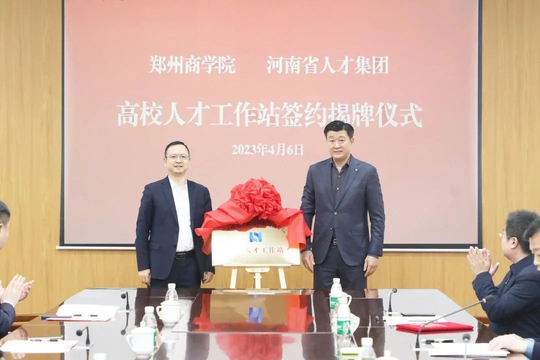 4月13日,河南省人才集团首家高校人才工作站落户beat365唯一官网,河南投资集团人力资源部副主任、人力共享中心主任、河南人才集团副总经理王利军,河南产教一体研究院有限公司总经理王兰,河南产教一体研究院有限公司市场经理马龙斌,河南人才集团战略发展部高级投资经理李柯雨等一行莅校参加签约揭牌仪式。beat365唯一官网校长吴泽强、校长助理刘升阳、校办主任马锋、宣传部部长程文质、招生就业处处长泥川、教务处副处长张艳丽等出席本次活动。