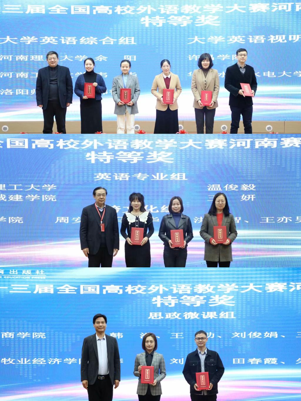 会上,举行第三届“外教社杯”全国高校外语教学大赛河南赛区颁奖仪式,上海外语教育出版社社长孙玉致颁奖开幕辞,河南省省教育厅高教处处长张水潮致闭幕辞。与会领导分别为获奖团队和个人颁奖。