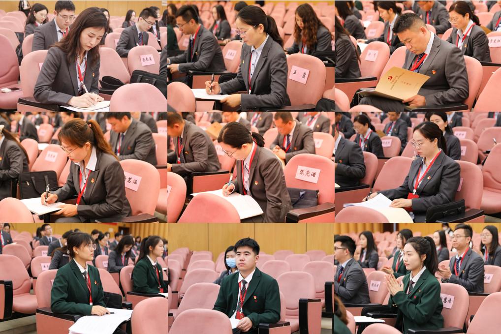 会议厅气氛庄严、热烈,大会主席台后方正中悬挂着由镰刀和锤头组成的党徽,十面鲜艳的红旗分列两侧。大会伊始,全场起立,奏唱《中华人民共和国国歌》。