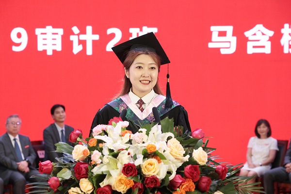 教师代表、信工学院张晓冬老师代表广大教职工祝贺毕业生顺利毕业,送上殷殷嘱托;在校生代表、外语学院王鹏莹同学致欢送词;毕业生代表、会计学院马含樱同学代表毕业生致谢词。