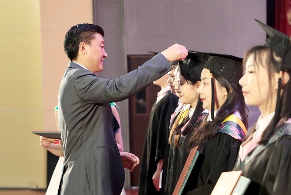 吴泽强校长为毕业生代表颁发毕业证书、学位证书并扶正流苏