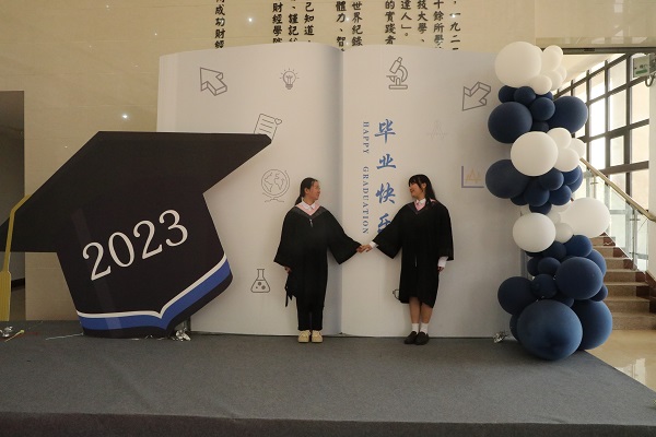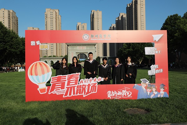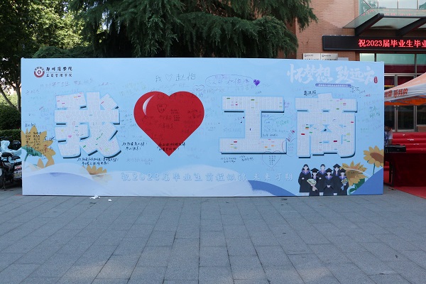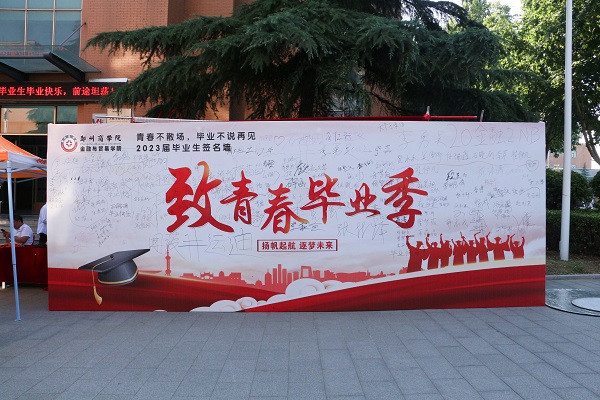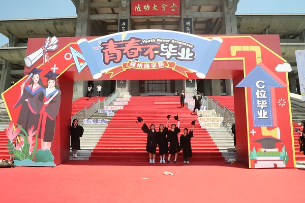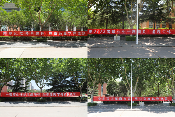 学校大门悬挂“热烈欢送2023届毕业生”条幅;校园内放置多样的的拍照打卡造型,吸引了许多毕业生驻足拍照;各楼宇电子屏滚动播放着毕业祝福语;成功大会堂内气氛热烈,大幅祝福语“欣逢盛世当不负盛世 肩负荣光当焕发荣光”“祝2023届全体毕业生鹏程万里,扬帆远航!”“无论天南地北 郑商是你们永远的故乡 任凭岁月更迭 你们是母校永远的牵挂”耀眼夺目;定制的“我们毕业啦”巨型留影墙鲜艳活泼;各种美好的祝愿标语在郑商校园飘扬。