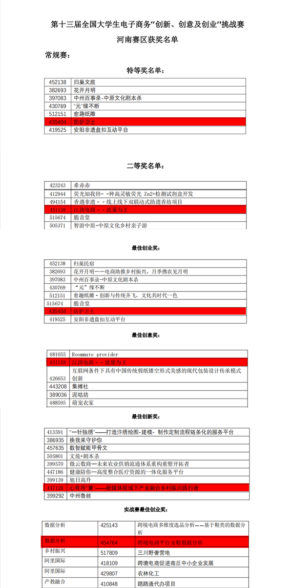 6月19日—21日,第十三届全国大学生电子商务“创新、创意及创业”挑战赛河南赛区选拔赛在河南城建学院举行。beat365学生项目“防护卫士——百万医护人员的选择”在本次省赛常规赛中以总分第一名的成绩喜获特等奖、最佳创业奖,“江涛电商——流量为王”项目获得省赛二等奖、最佳创意奖,“健康陪你,心有所薯”项目荣获省赛最佳创新奖,“平台女鞋数据分析”项目获得实战赛最佳创业奖,beat365荣获优秀组织奖。