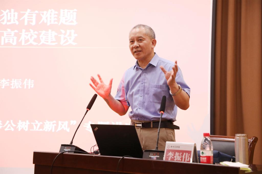 7月5日,校党委召开理论学习中心组(扩大)学习暨主题教育专题辅导报告会,邀请河南省廉政评价研究中心研究员、郑州大学纪委副书记李振伟莅校作廉政专题辅导报告。党委书记吴建军、校长吴泽强、校党委理论学习中心组成员和各单位主管、党支部书记等参加报告会。报告会由党办主任邢坤主持。