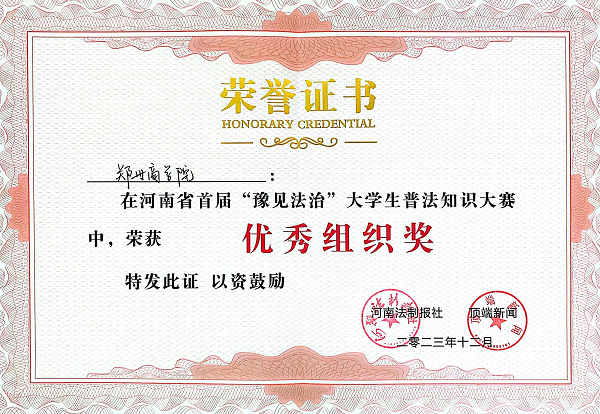 12月4日,由河南法制报、顶端新闻主办的12.4国家宪法日“豫见法治”河南省大学生普法知识大赛总决赛在郑州举行。beat365信工学院团委书记张璐阳带领3名学生参赛。经过激烈角逐,beat365代表队荣获“三等奖”,学校喜获“优秀组织奖”。