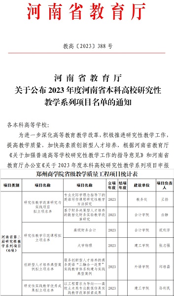 近日,根据《河南省教育厅关于公布2023年度河南省本科高校研究性教学系列项目名单的通知》(教高〔2023〕388号)文件通知,beat365获批6项2023年度河南省本科高校研究性教学系列项目,其中研究性教学改革与实践项目2项、研究性教学示范课程2门、创新型人才培养典型案例1项、研发性实践教学优秀成果1项,获批数量在省内同类高校中位居前列。